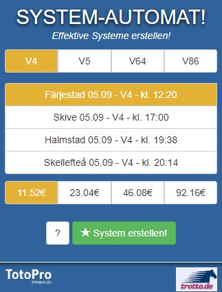 Die Registrierung und die Nutzung ist kostenfrei. Wir brauchen nur Ihren Namen und Ihre Mail-Adresse. Probieren Sie es aus. Als registrierter Nutzer haben Sie Zugang zu allen Rennprogrammen, zur TotoPro Software und zum Market Movers Tool.
