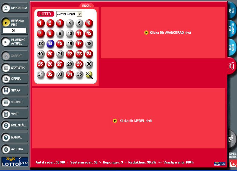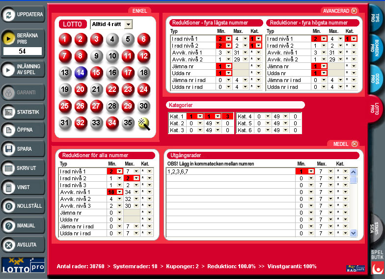 LottoPro ger dig möjlighet att få med fler nummer till ett lägre inlämningspris än vad du normalt skulle få betala. Med många nummer blir det extra spännande i dragningarna på onsdagar och lördagar! Alla funktioner i en enda programbild gör programmet mycket överskådligt. Programmet har många spännande och effektiva reduktionsmöjligheter på flera nivåer som får ner ditt inlämningspris - samtidigt som du har kontroll över dina reduceringar. Du kan spela på dina s.k. "turnummer", min./max. antal udda och jämna nummer, fyra lägsta och fyra högsta nummer bara för att nämna några av de många reduceringar som finns i programmet. Att välja mellan garantierna "Alltid 4, 5 eller 6 rätt" reducerar också priset en hel del. Du kan använda upp till 70 stycken utgångsrader och även spela kategorispel på alla reduktioner som du har använt dig av i systemuppställningen. LottoPro har även en modul med statistik fr.o.m. den allra första Lottodragningen år 1980.