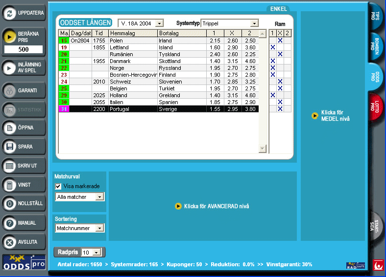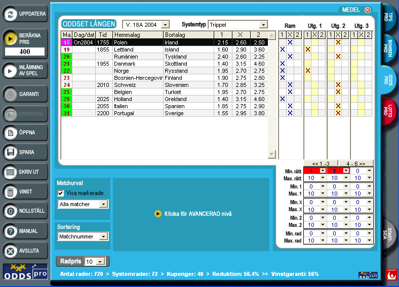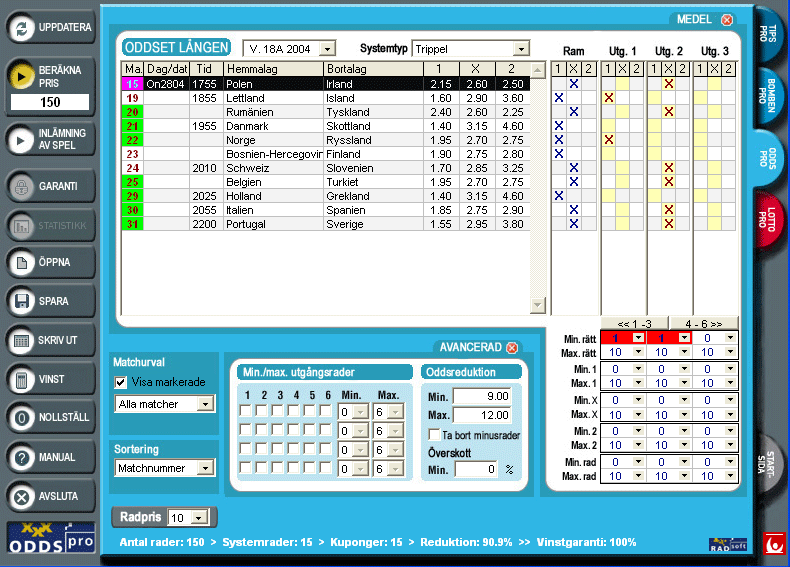 OddsPro är det verktyg du behöver för att vinna regelbundet på Oddset/Lången. Spelar du system på Lången ökar du verkligen dina vinstmöjligheter. Med OddsPro kan du både gardera matcher och spela grupper utan att öka inlämningspriset - det enda du ökar är dina vinstchanser! Om en kupong med t.ex. ett helgarderat Fyrlingsystem kostar 810 kr att lämna in utan att spela systemspel så behöver du bara betala 210 kr med OddsPro. Du kommer ner i detta låga inlämningspris genom att sätta krav på att du måste ha rätt tecken med i två av tre matcher.