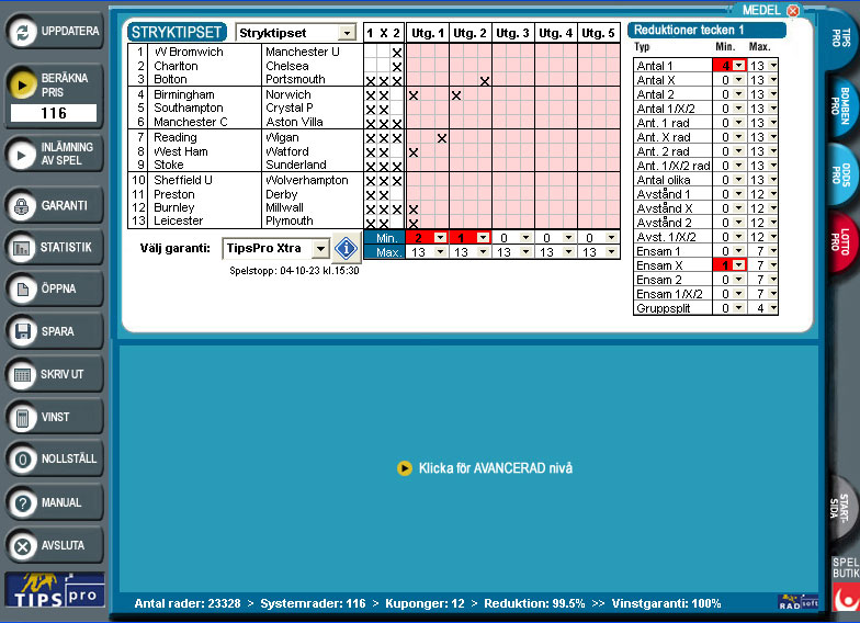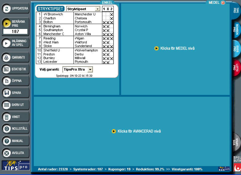Med Skandinaviens ledande tipsprogram kan du spela både Stryktipset och Europatipset. Du behöver inte vara stortippare för att vinna med TipsPro - tvärtom! Med TipsPro kan du tippa för små belopp och ha lika stora - eller större - chanser än en tippare som inte använder sig av det här programmet. Som exempel kan du lämna in en kupong som normalt kostar 5 184 kr utan TipsPro för bara 136 kr med TipsPro. Då är du garanterad minst 11 rätt och har nästan 40 % chans till 12 rätt varje gång bara teckenramen för systemet håller. Är du en erfaren systemspelare så kan du använda dig av en mer avancerad nivå och sätta upp stora komplicerade system med mycket kraftfulla reduktioner.