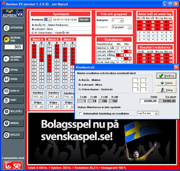 Bomben VX är det program som slår det mesta att kunna spela reducerade system på Oddset Bomben med kort stubin till de höga oddsen, speciellt med spel på 4 matcher. När du spelar lämnar du snabbt och enkelt in ditt system direkt över Internet mot Svenska Spel, så mycket enklare och bättre kan inte bli.